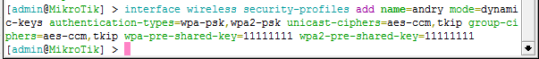5. kemudian tambahkan security profile, dengan password / wpa-pre-shared-keynya adalah password Hotspot/Access Point yang digunakan nantinya.