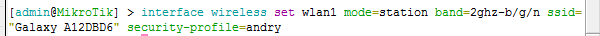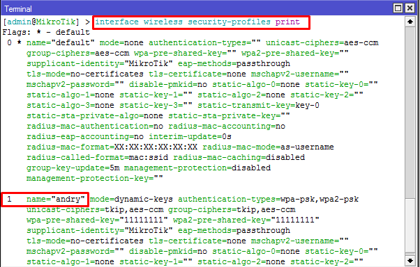 6. lihat security profile yang telah ditambahkan dengan perintah “interface wireless security-profiles print“.