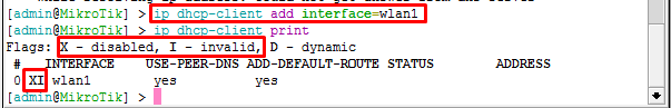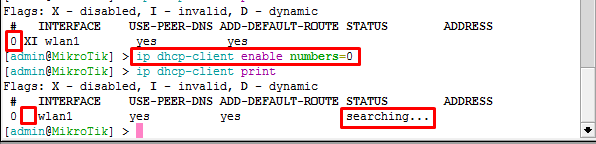 11. bila sudah, maka status XI (invalid and disabled) kita enable terlebih dahulu, dengan perintah “ip dhcp-client enable numbers=0“