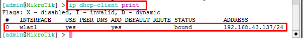 12. lihat lagi pada bagian ip dhcp client print, bila sudah maka akan muncul status bound dan mendapat ip address otomatis dari ISP. Bila belum ada dan statusnya masih searching, anda bisa ulang lagi perintah “ip dhcp-client print” hingga muncul ip addressnya.
