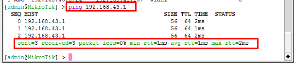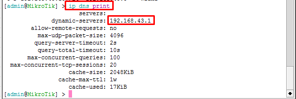 14. kemudian tak lupa, untuk mengecek ip dns denagn perintah “ip dns print“.