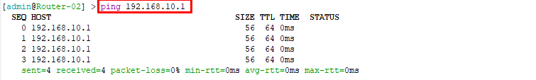 2. Lakukan uji Ping pada Winbox dengan IP Network yang akan dituju yaitu Client Router-01 dengan perintah ping 192.168.10.1, bisa dilihat statusnya Reply tanda berhasil terhubung ke Client.