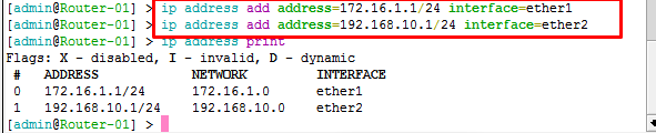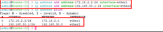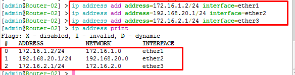 2. Lakukan Konfigurasi IP Address pada Router-01, Router-02 dan Router-03 pada setiap Interface. Dengan menggunakan perintah ip address add address=x.x.x.x/24 interface=ether(Y)