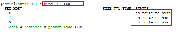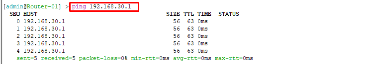 7. Lakukan uji Ping ke Router-03, dengan menggunakan perintah ping 192.168.30.1. Maka statusnya akan reply.
