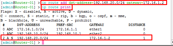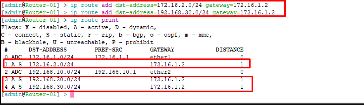 - Lakukan Konfigurasi Routing dengan perintah ip dst-address ke arah IP Network yang dituju, kemudian Gateway yang diarahkan ke IP Gateway yang dilewati paket untuk menuju ke tujuan dengan menggunakan perintah ip route add dst-address=x.x.x.0/24 gateway=x.x.x.x ( sama halnya dengan langkah no 3 pada Konfigurasi Routing di Router 01 ).