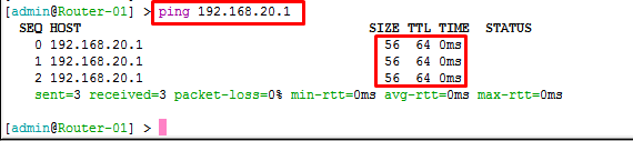 2.. Lakukan uji Ping pada Winbox dengan IP Network yang akan dituju yaitu Client Router-02 dengan perintah ping 192.168.20.1, bisa dilihat statusnya Reply tanda berhasil terhubung ke Client.