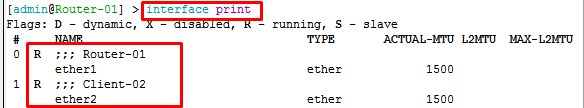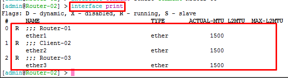 - Pertama-tama, lihat terlebih dahulu pada masing masing Interface yang terdapat di Semua Router dengan menggunakan perintah interface print.