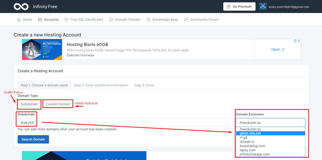 4. Tentukan nama website yang diinginkan sertya domain akhiran / domain extension yang telah disediakan serta password dan captcha.